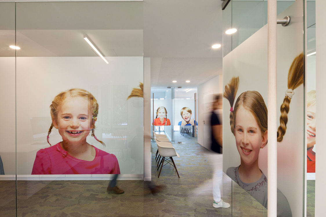 Während die 6 Behandlungsräume, das Labor, Personalraum, Officeräume, Büros und Warteraum an den Aussenfassaden angeordnet wurden, liegen alle Nebenräume in einer Kernzone und sind über die Flurzone erreichbar. Alle Behandlungsräume sind über eine Glaswand mit dem Flur optisch verbunden. Über diese fällt Tageslicht in den Flur. Gestalterisch ist die gläserne Flurwand durch große, aneinandergereihte Porträtaufnahmen von Erwachsenen und Kindern aufgelockert.