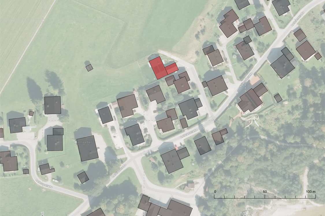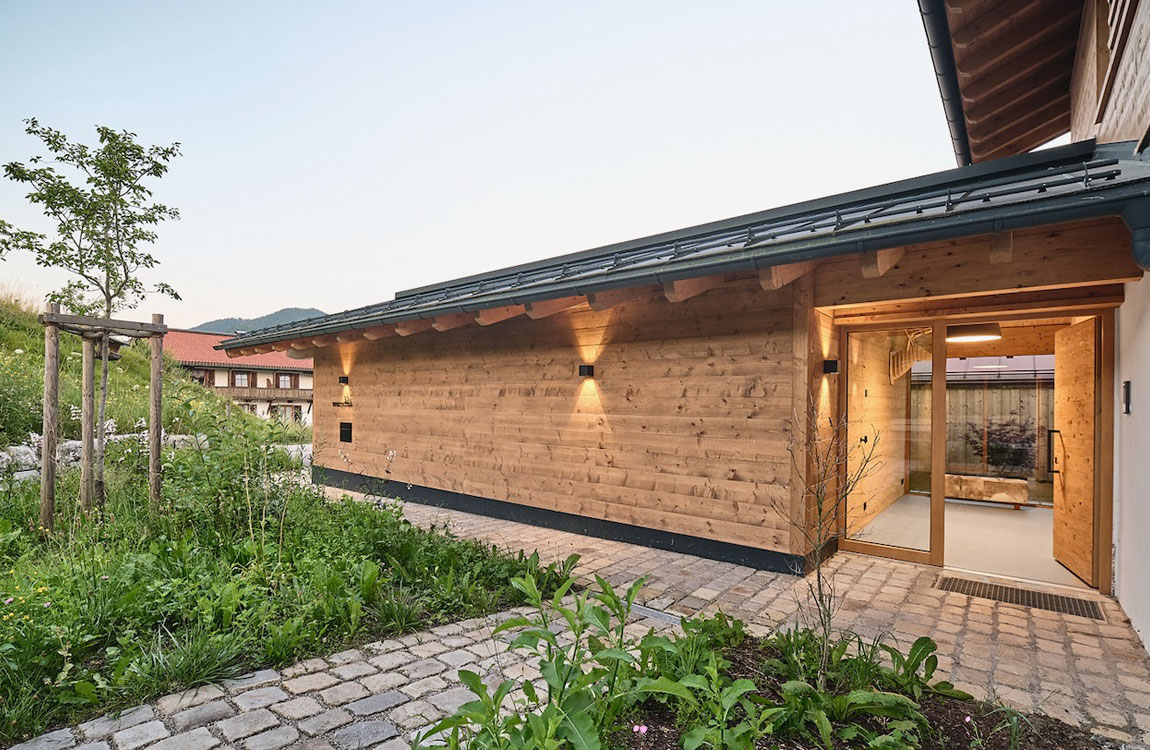 Das Gebäude ist klar gegliedert: Ein massiver, verputzter Sockel im Erdgeschoss bildet das Fundament und nimmt Bezug auf die ortstypischen Putzbauten. Darüber liegt ein leichter, mit heimischem Nadelholz verschalter Baukörper, dessen horizontale Lattung die natürliche Alterung des Materials bewusst zulässt und damit den Bezug zur Umgebung über die Zeit stärkt.