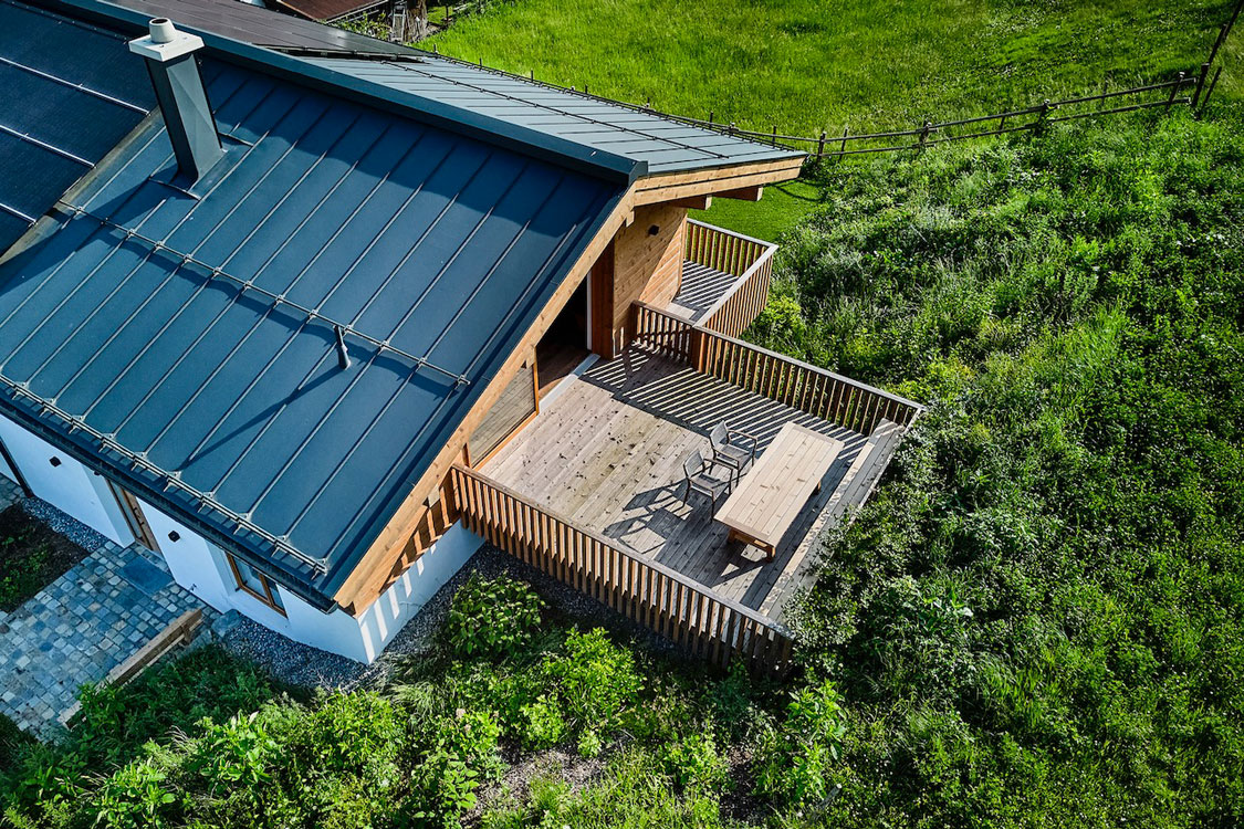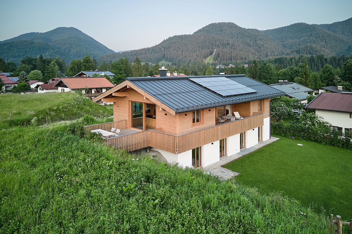 Große, schützende Dachüberstände nehmen die traditionelle Dachform auf, während ihre präzise Ausbildung und die klare Linienführung die zeitgenössische Architektursprache des Hauses betonen.