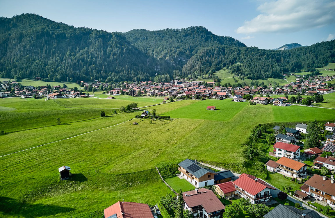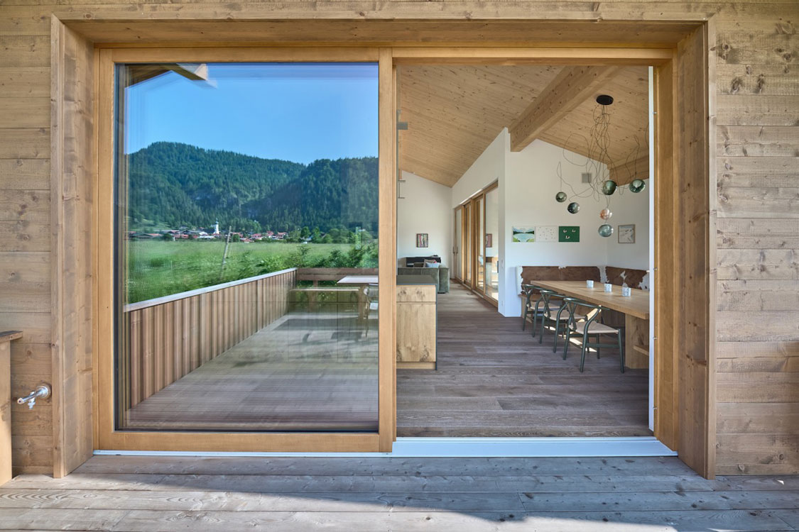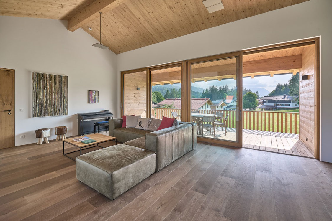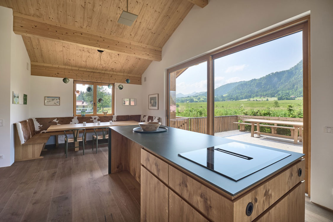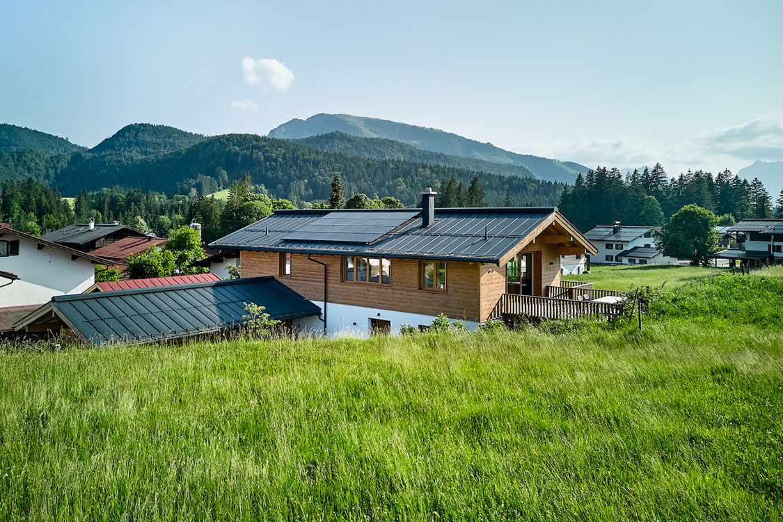 Das Haus liegt ruhig und sonnig am Ende einer privaten Zufahrt in einer Sackgasse, umgeben von Wiesen und mit freiem Blick auf das Panorama des Zahmen Kaisers in Österreich und die Kirche von Reit im Winkl. Die besondere Topografie des Grundstücks mit einem geschosshohen Geländesprung zur nördlich anschließenden Wiesenlandschaft ermöglicht es, dass das Obergeschoss ebenerdig in die Landschaft übergeht. Vom Koch- und Essbereich aus öffnet sich der Raum direkt ins Freie – ein Übergang, der die Verbindung zwischen Innenraum und Umgebung zusätzlich stärkt.
