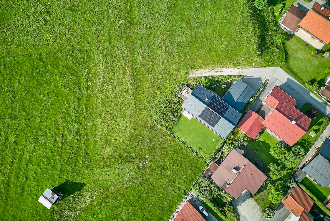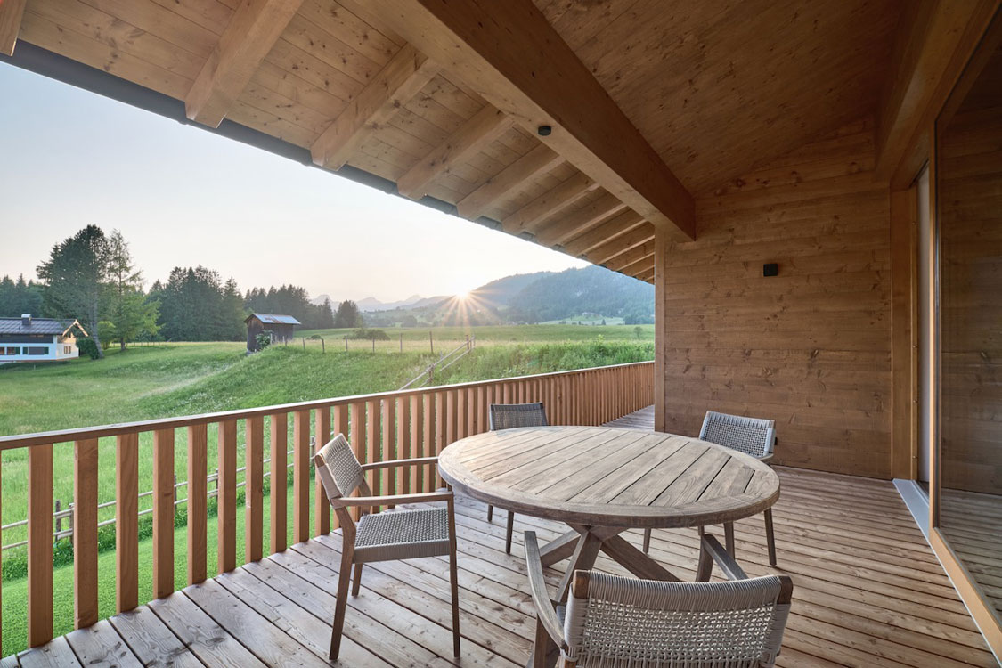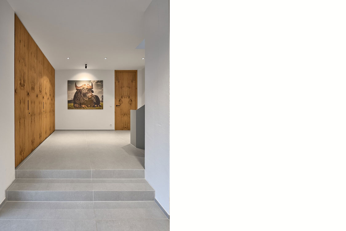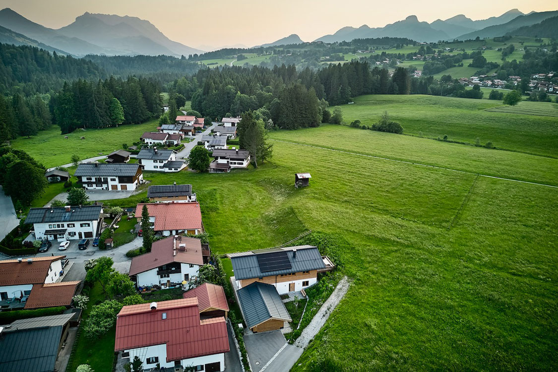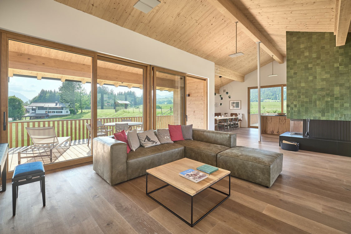 Das Haus liegt ruhig und sonnig am Ende einer privaten Zufahrt in einer Sackgasse, umgeben von Wiesen und mit freiem Blick auf das Panorama des Zahmen Kaisers in Österreich und die Kirche von Reit im Winkl. Die besondere Topografie des Grundstücks mit einem geschosshohen Geländesprung zur nördlich anschließenden Wiesenlandschaft ermöglicht es, dass das Obergeschoss ebenerdig in die Landschaft übergeht. Vom Koch- und Essbereich aus öffnet sich der Raum direkt ins Freie – ein Übergang, der die Verbindung zwischen Innenraum und Umgebung zusätzlich stärkt.